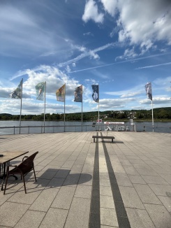 Die Friedensfahnen, von regionalen Künstler/innen gestaltet, sind bis dahin noch an der Rheinpromenade in Remagen zu sehen, Caracciolaplatz.