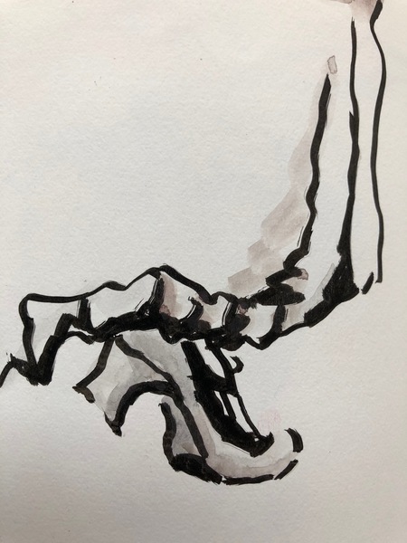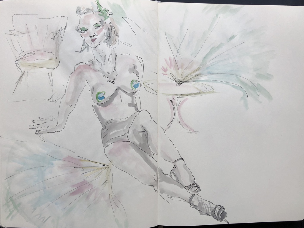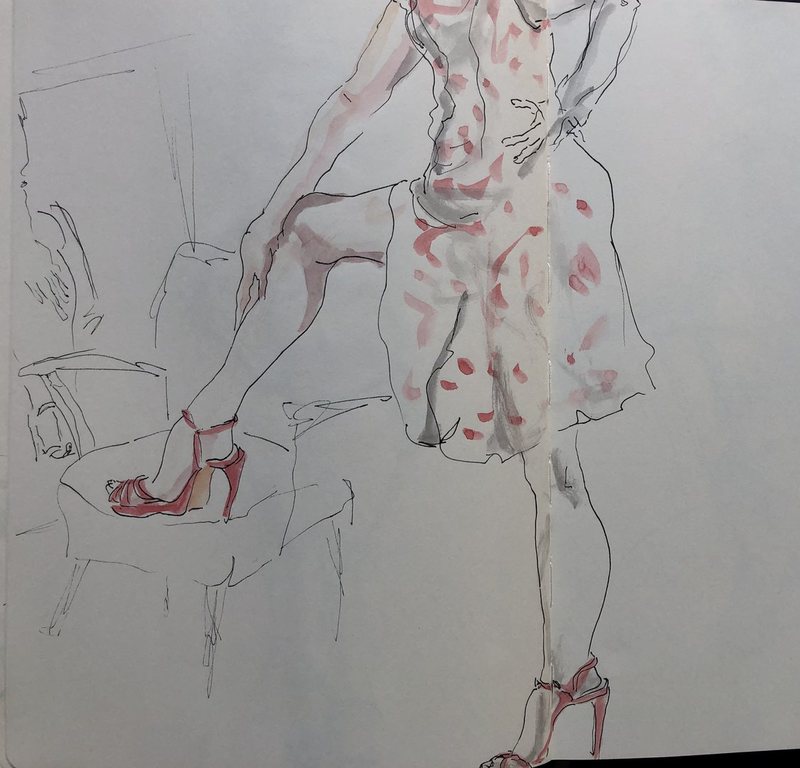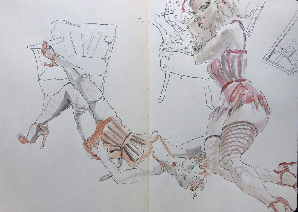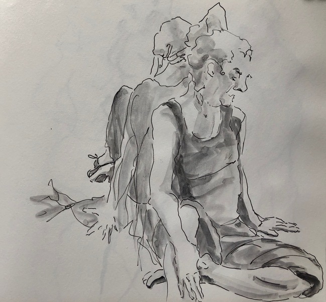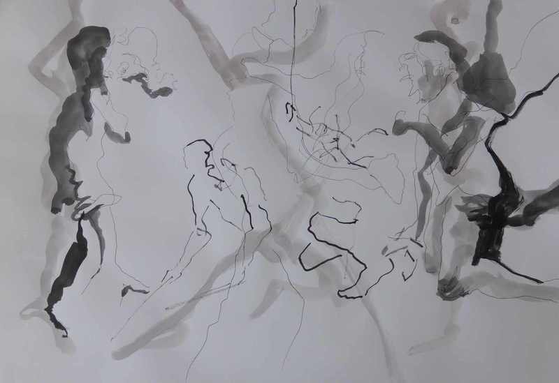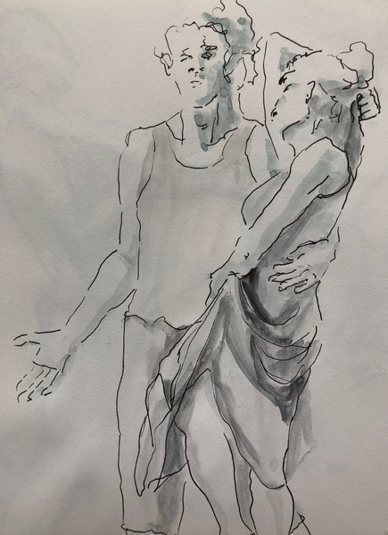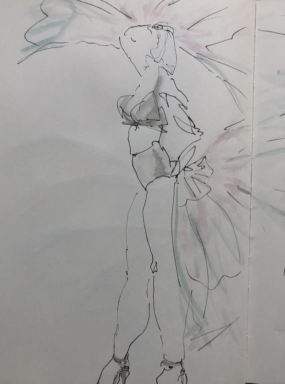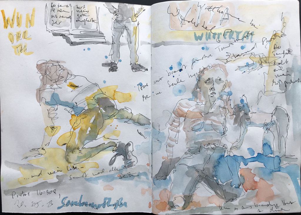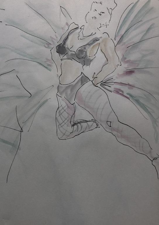 Ich durfte bei den Proben zusehen und zeichnen. Aktuell bearbeitete ich die Skizzen im Atelier weiter mit Tusche oder Aquarell.