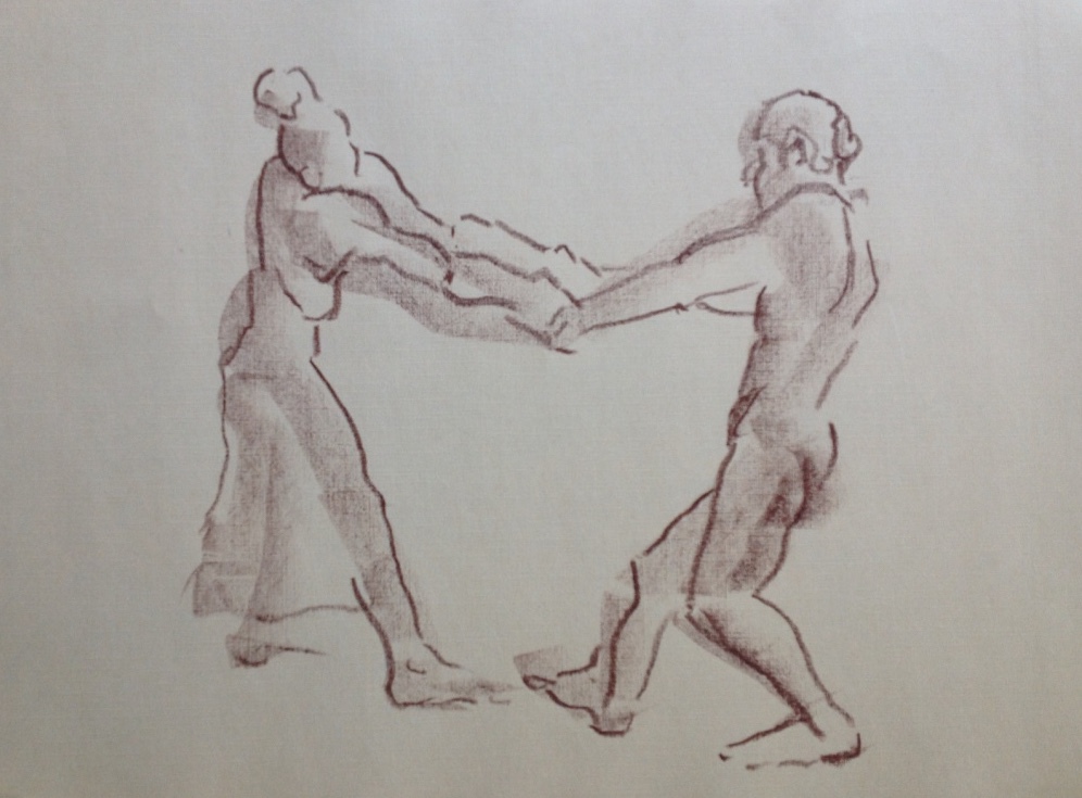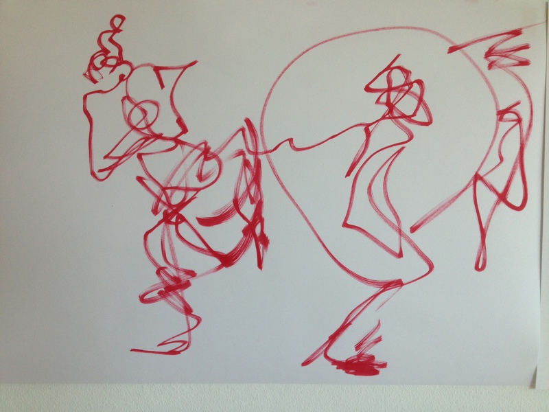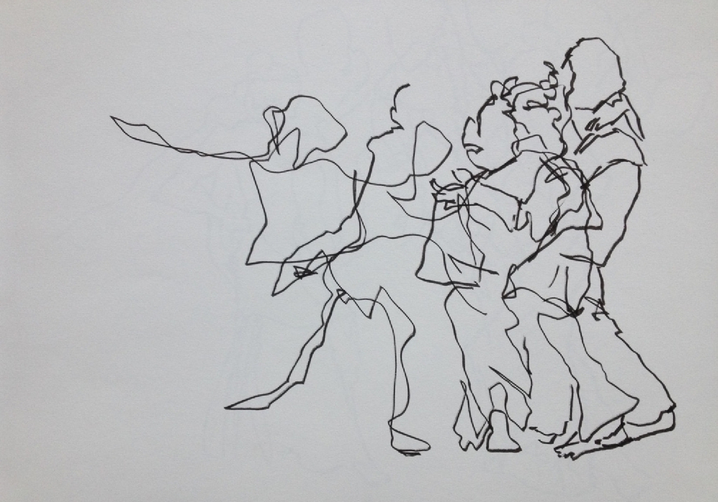 Die Bewegungen der Tänzer sind in einer speziellen Zeichentechnik eingefangen, der sogenannte "Blindzeichnung", bei der das Motiv/die Bewegung gezeichnet wird, ohne dabei auf das Papier zu blicken.